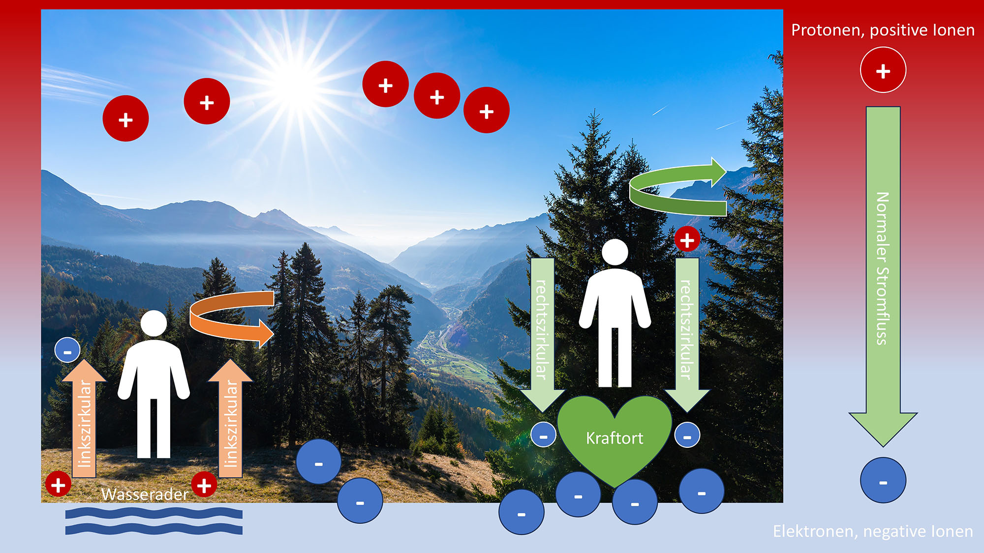 Kraftorte verstärken diesen Stromfluss, da hier die negativen Ionen vermehrt auftreten (an Wasserfällen messbar). Das rechtszirkulare Magnetfeld wird verstärkt. Es wirkt anregend auf unseren Körper, wir können Energie tanken. Dieses Feld wird als Schlafplatz ebenfalls nicht empfohlen, da ein Kraftort zu anregend wirkt und wir dann nicht zur Ruhe kommen können.